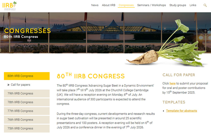 هشتادمین کنگره موسسه بین‌المللی تحقیقات چغندرقند (IIRB) با عنوان "توسعه چغندرقند در محیطی پویا" از ۷ تا ۹ جولای ۲۰۲۶ (برابر با 16 لغایت 18 تیر 1405) در دانشکده چرچیل واقع در دانشگاه کمبریج انگلستان برگزار خواهد شد.