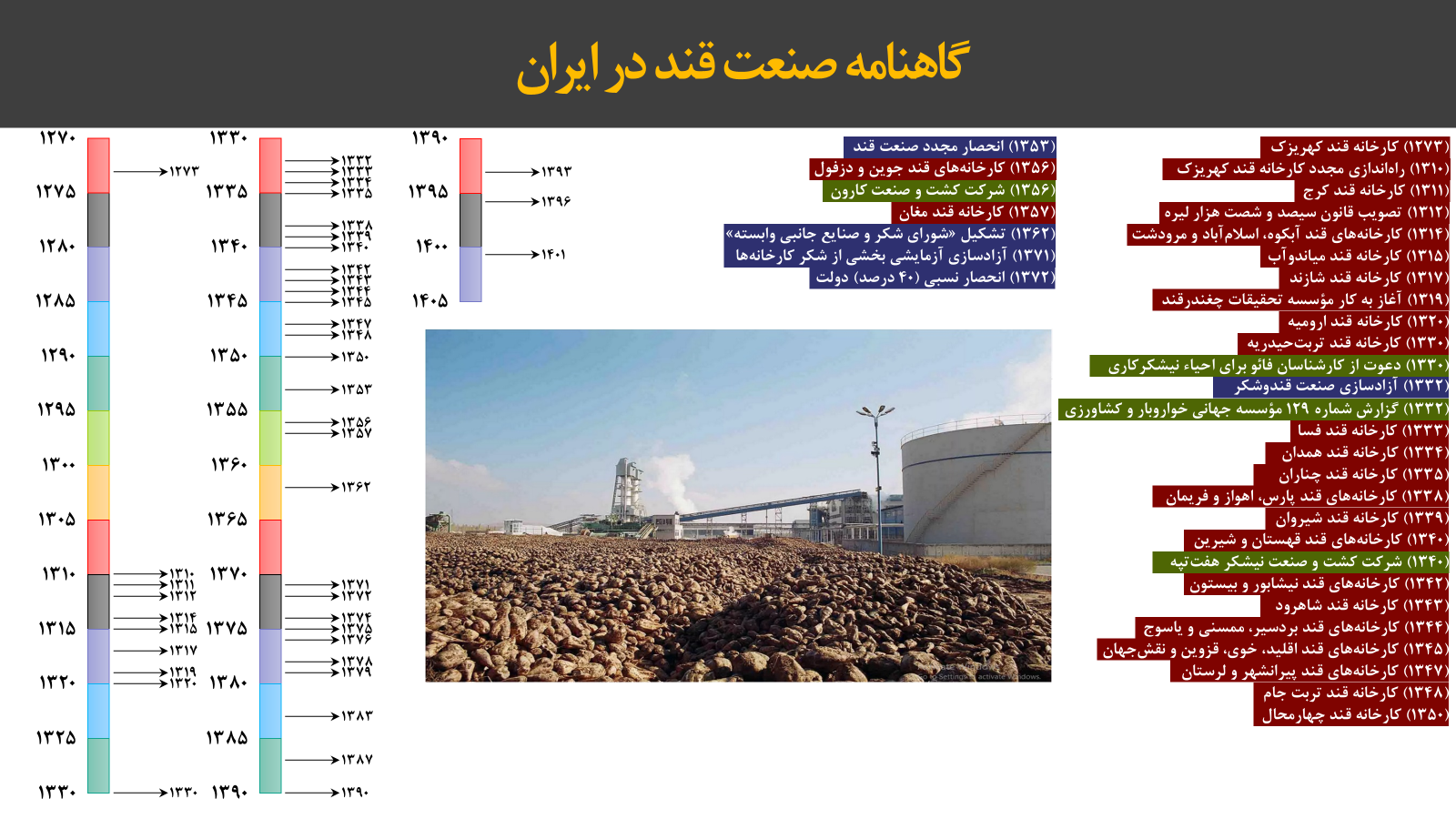صنعت قند در ایران در سال 1273 ه.ش. با احداث اولین کارخانه قند در کهریزک پایهگذاری شد ولی بهواسطه اعمال نظر کشور روسیه بهرهبرداری از کارخانه مذکور تا سال 1310 به تعویق افتاد. چغندرکاری در ایران در سال 1310 آغاز و اولین محصـول آن بهمیزان 42 تن شکر در کارخانه قند کهریزک تولید شد. به موازات افزایش مصرف قندوشکر در کشور، کارخانههای جدید احداث و کشت چغندرقند توسعه یافت.