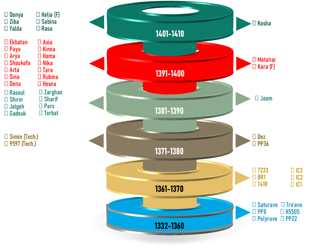 مجموعه رقمهای مولتیژرم (راست) و منوژرم (چپ) اصلاح شده در مؤسسه تحقیقات اصلاح و تهیه بذر چغندرقند طی دهههای مختلف